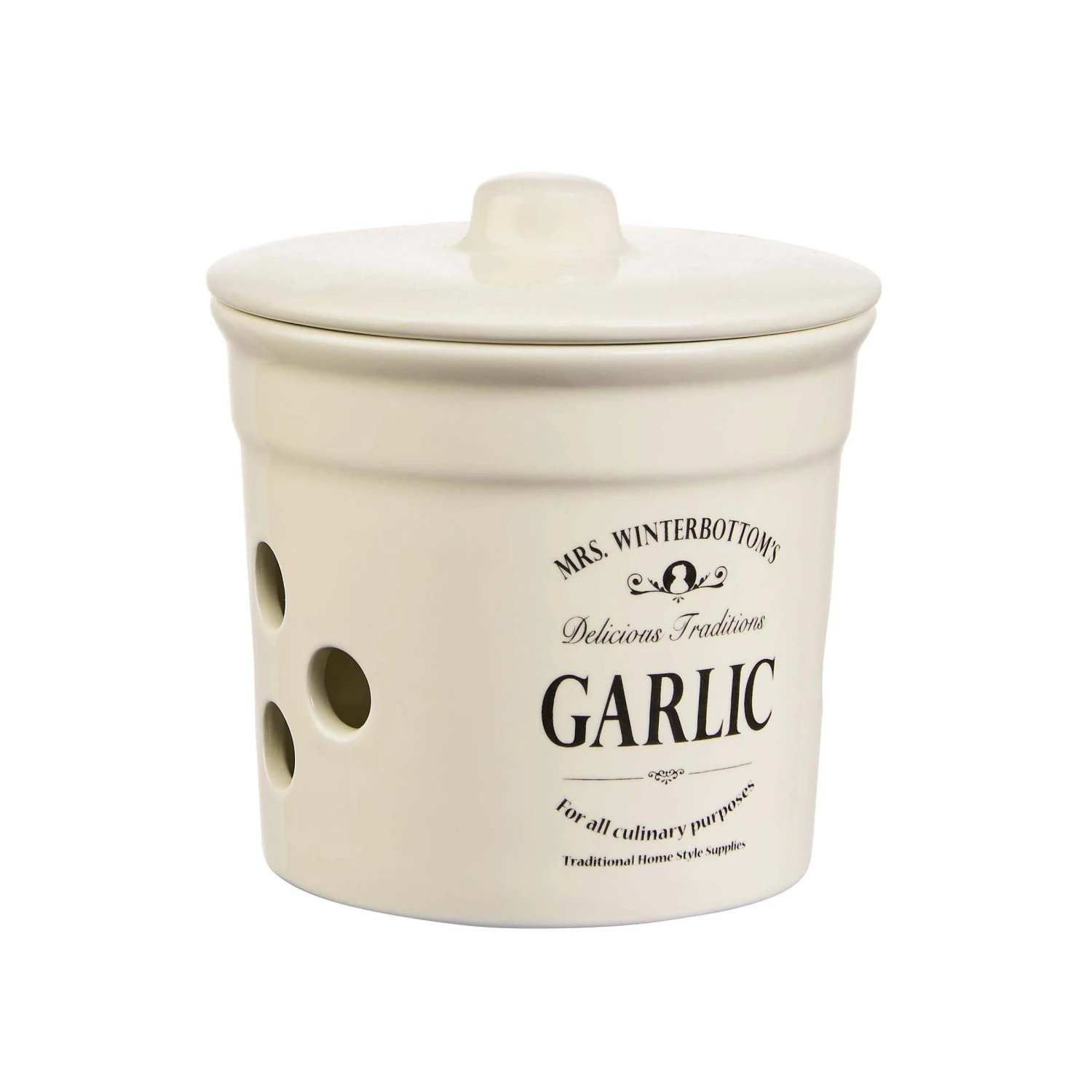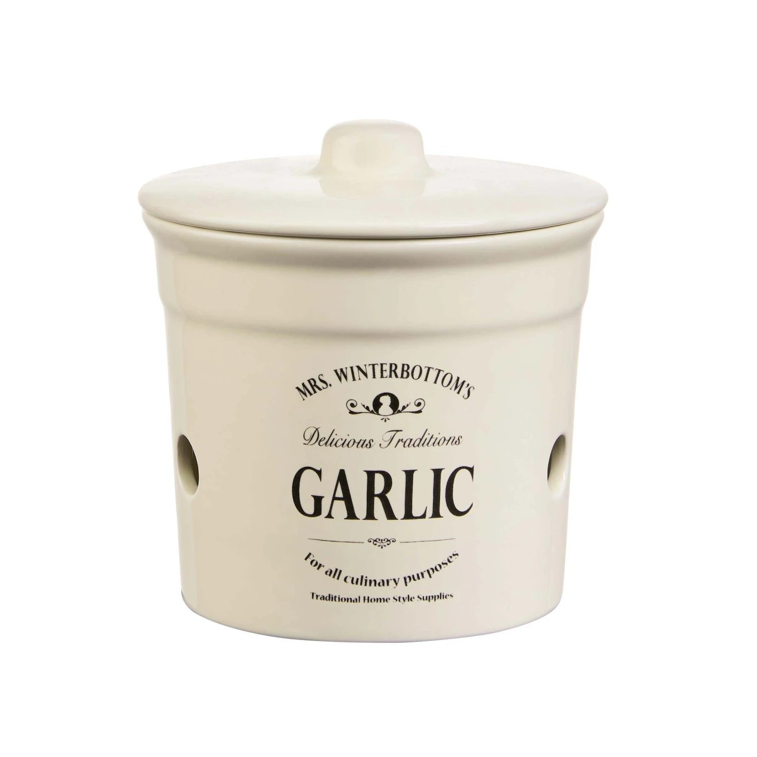 Mit dem Mrs. Winterbottom’s Knoblauchtopf im englischen Vintage Design bringen Sie Ordnung mit System in ihre Küche! Geräumig und stilvoll bietet der runde Behälter mit einem 14 cm Durchmesser genügend Platz für die Knoblauch-Lagerung und das Aufbewahren anderer Vorräte. Der Topf mit Deckel bietet Schutz vor Dreck, lagert alles ordentlich und trocken durch praktische Luftlöcher und passt mit seiner Retro Form perfekt in typische Küchen im modernen oder Landhausstil.